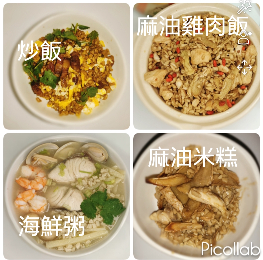4.加佐料調理成各式無澱粉米食,如蛋炒飯、肉燥飯、麻油雞飯、粽子、米糕、醬拌飯、油蔥酥粥、廣東粥、海產粥.....等