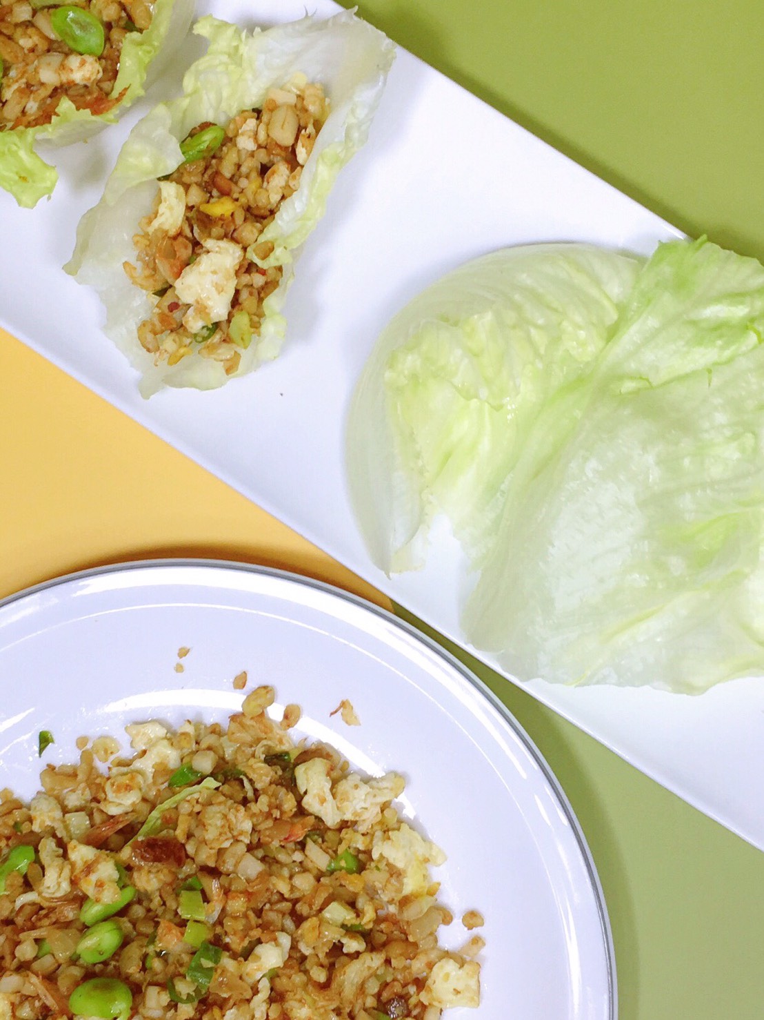 【生菜捲炒飯】回溫後的無澱粉炒飯置入生菜如萵苣中,捲起包之;好吃。