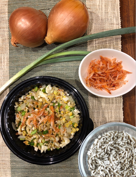 用「W澱粉米麵粉」為主原料,佐以日曬櫻花蝦加上清甜的洋蔥、豆類、蛋,搭配無澱粉米粒,成功研製的「醣享炒飯」,好吃健康。不是花椰菜。